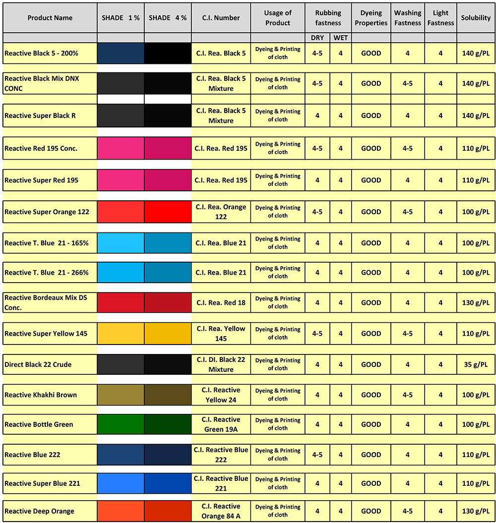 We can provide Wool Application Reactive Dyes, Highly concentrated Reactive Black Dyes & PCA FREE Dyes.